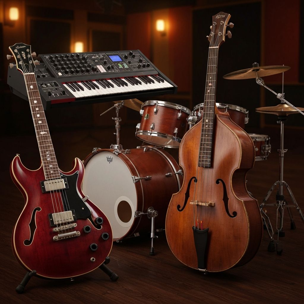 Guitarras, violões, teclados, baterias e equipamentos de áudio.